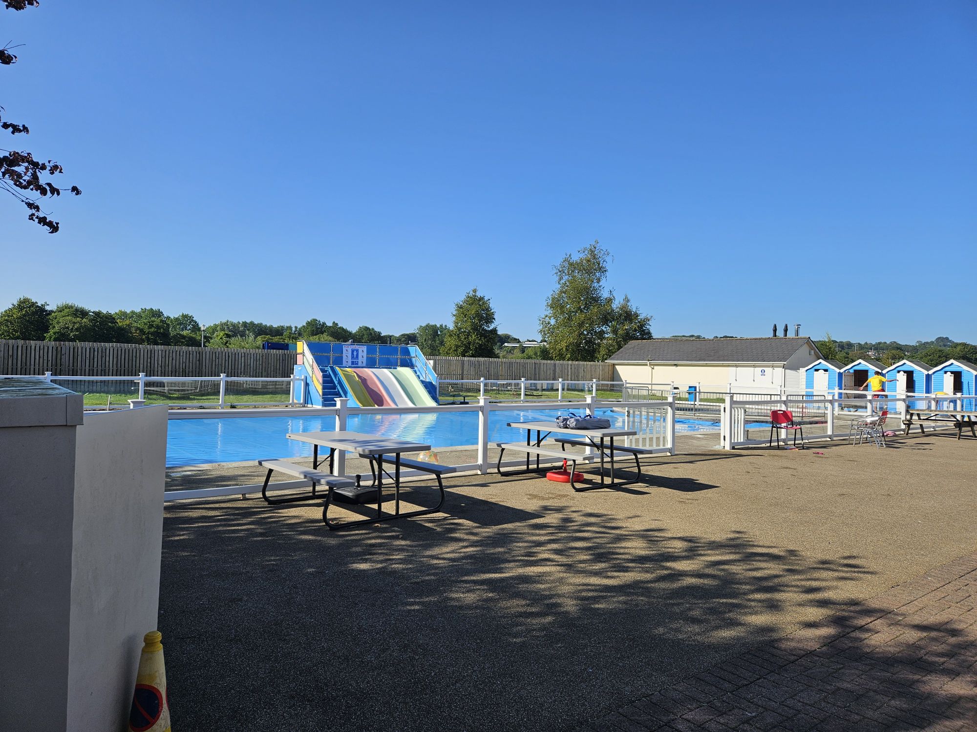 Kiln Parks outdoor pool is small but it does have a multi lane slide into it. There is also a smaller pool to the far end. They have a few bench seats around the outside along with changing facilities.